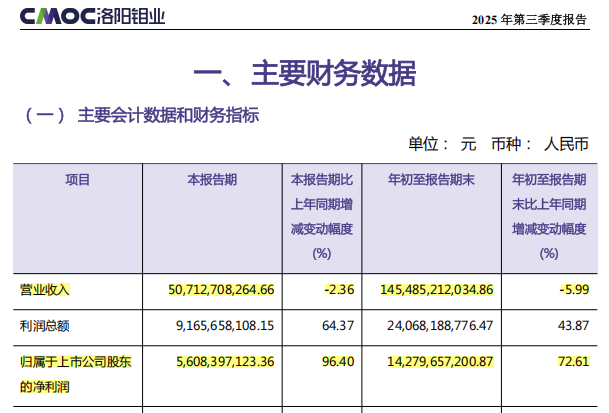 業(yè)績方面,據(jù)洛陽鉬業(yè)10月24日發(fā)布的業(yè)績公告,今年前三季度,公司實(shí)現(xiàn)營業(yè)收入1454.85億元,同比減少5.99%;歸屬于上市公司股東的凈利潤超越2024年全年業(yè)績,達(dá)142.8億元,同比增長72.61%。