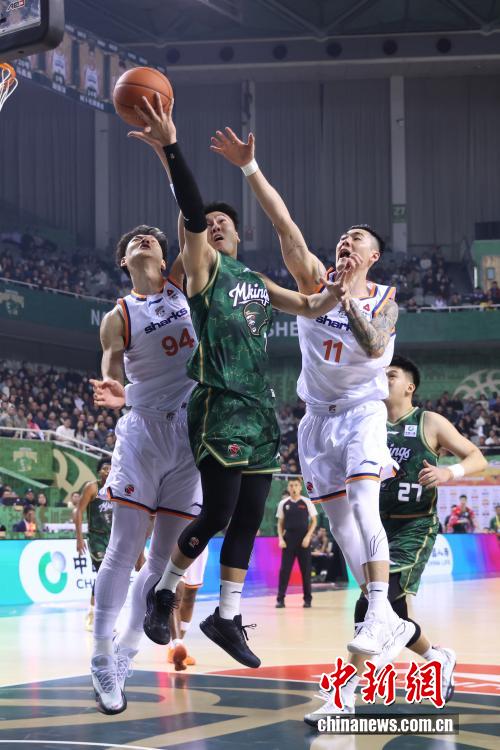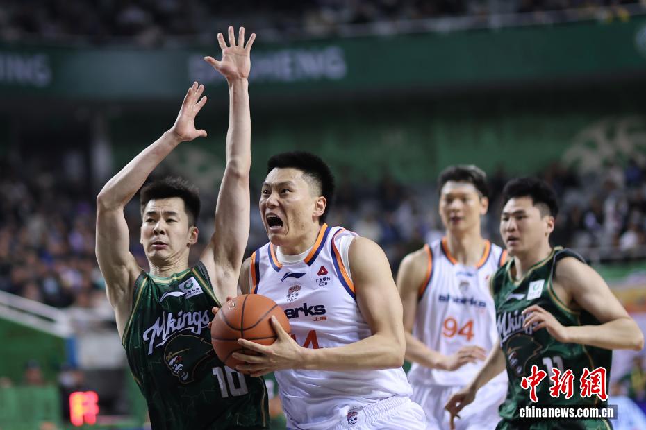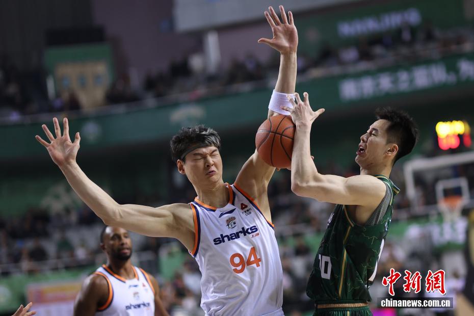 12月16日晚,在江蘇南京舉行的2025-2026賽季中國男子籃球職業聯賽(CBA)常規賽比賽中,南京天之藍隊(綠衣)主場105比97戰勝上海久事隊(白衣)。圖為上海久事隊球員王哲林(右二)在比賽中防守。