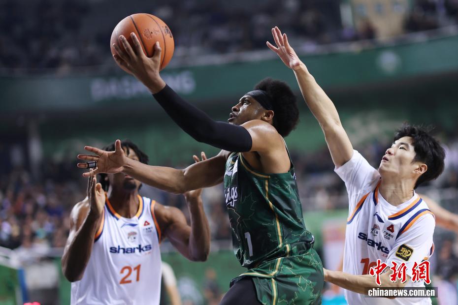 12月16日晚,在江蘇南京舉行的2025-2026賽季中國男子籃球職業聯賽(CBA)常規賽比賽中,南京天之藍隊(綠衣)主場105比97戰勝上海久事隊(白衣)。圖為南京天之藍隊球員拉維特(中)在比賽中投籃。