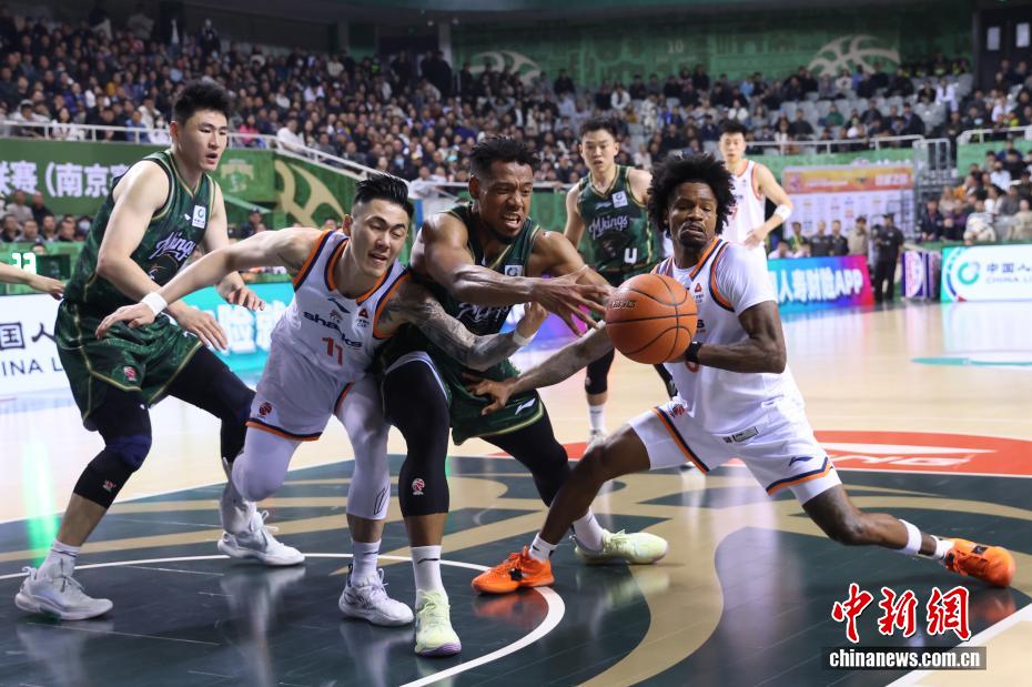 12月16日晚,在江蘇南京舉行的2025-2026賽季中國男子籃球職業聯賽(CBA)常規賽比賽中,南京天之藍隊(綠衣)主場105比97戰勝上海久事隊(白衣)。圖為上海久事隊球員古德溫(左二)在比賽中爭搶。