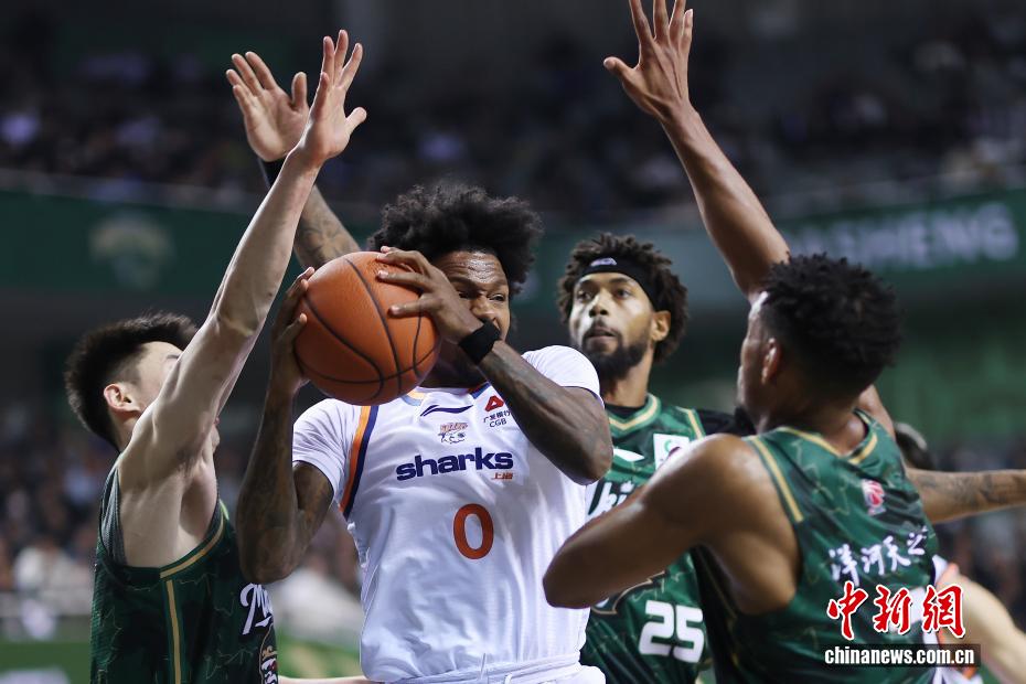 12月16日晚,在江蘇南京舉行的2025-2026賽季中國男子籃球職業聯賽(CBA)常規賽比賽中,南京天之藍隊(綠衣)主場105比97戰勝上海久事隊(白衣)。圖為上海久事隊球員弗格(右二)在比賽中爭搶。