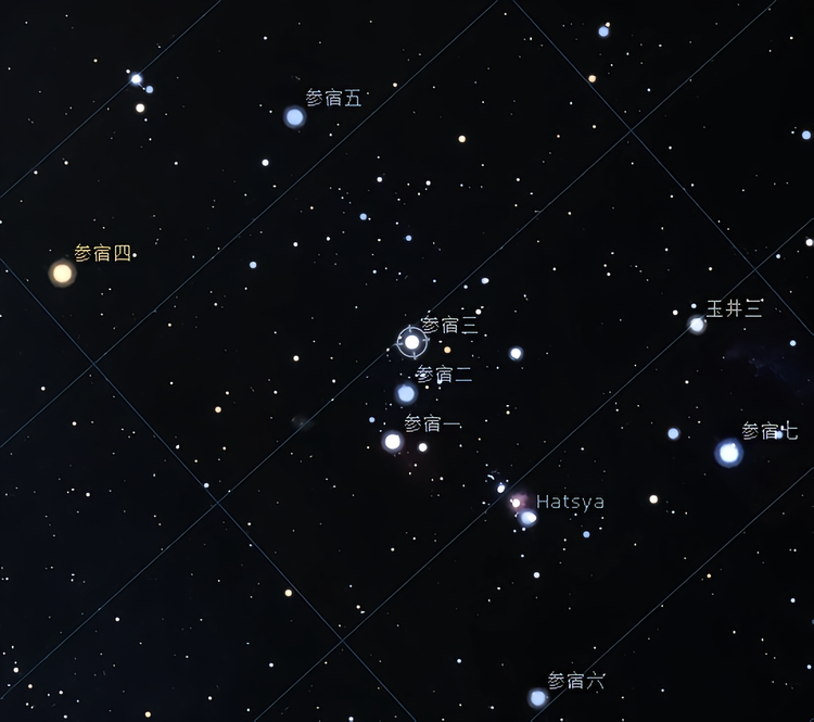 二、參宿:三顆整齊排列的“參三星”參宿(對應獵戶座的三顆腰帶星)是古人最熟悉、也最容易辨認的冬季星官。