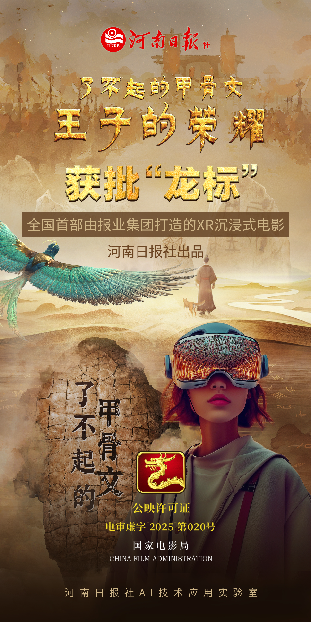 近日,由河南日報社打造的XR沉浸式電影《了不起的甲骨文·王子的榮耀》正式通過國家電影局審查,斬獲電審虛字〔2025〕第020號“龍標”。這不僅是全國首部由報業集團出品的虛擬現實電影,更是中國第20部“持證上崗”的XR電影,標志著傳統媒體跨界電影產業實現關鍵突破,也讓3000年前的甲骨文文明在虛擬現實技術的賦能下,完成了從“文字符號”到“沉浸式體驗”的華麗蛻變。