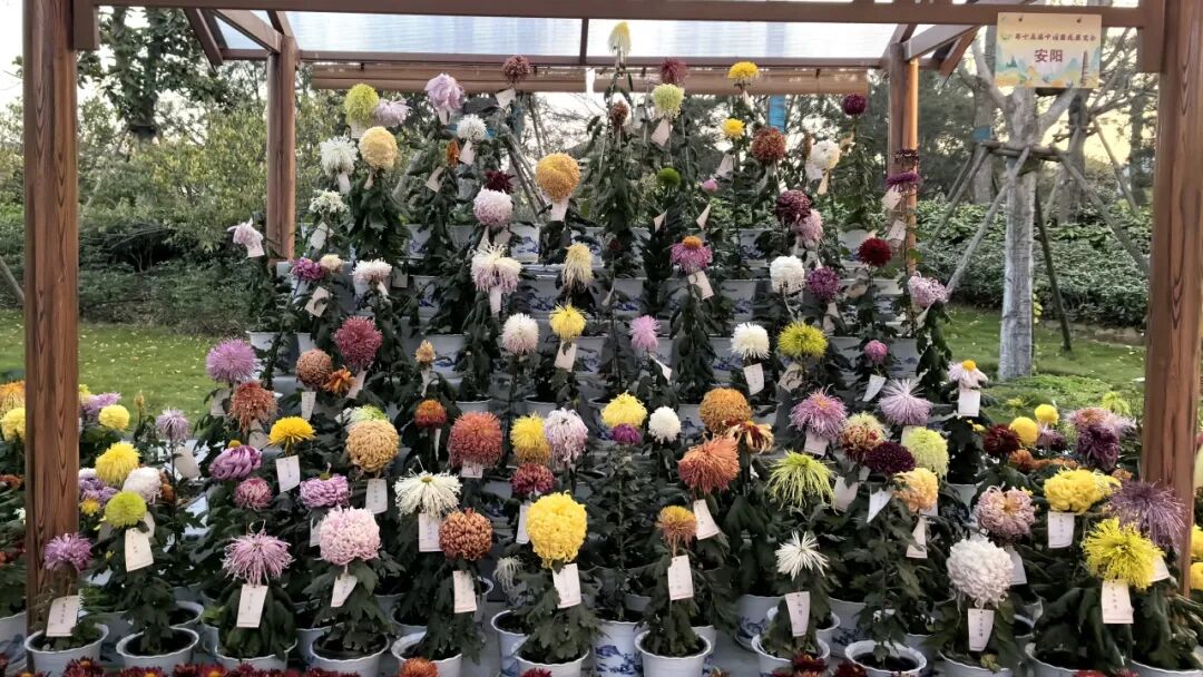 其中,標準展臺“菊香繞彩風、字韻逸華光”,插花藝術“盼”、“荷蓮菊夢”,懸崖菊、樁型盆景菊、景型盆景菊,專項品種太液嬌容多頭菊等斬獲金獎;塔菊、大立菊獨本、大立菊多色,插花藝術“籬落秋風”,樁型盆景菊,百菊賽競賽,專項品種玉波滌秋獨本菊等斬獲銀獎;新品種“洹水波濤”、“洹水小趣”、霜晴綴粉獨本菊,專項品種太液嬌容獨本菊、火鳳凰多頭菊、秀入精神多頭菊,插花藝術“現代菊韻”等獲得銅獎。