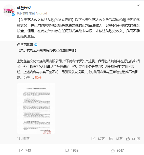 絲芭還表示,圖中公開的藝人收入為公司依約履行代扣代繳義務,并已向管轄地稅務機關依法完稅的正規合法收入,經得起任何形式的稅務核查。但是,在此之外如存在任何形式其他未申報、未依法納稅之收入,絲芭不承擔任何責任。