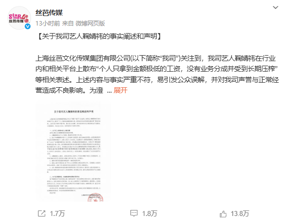 12月16日,絲芭傳媒連發三條聲明回應,稱鞠婧祎在行業內和相關平臺上散布“個人只拿到金額極低的工資,沒有業務分成并受到長期壓榨”等相關表述,與事實嚴重不符。