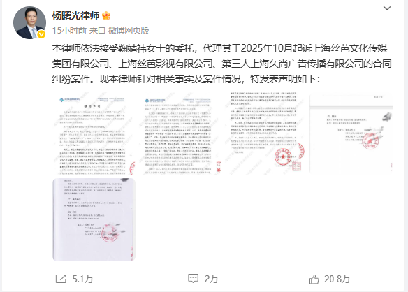 12月15日,絲芭起訴狀稱鞠婧祎合約至2033年引發熱議。鞠婧祎_Official?發布聲明,稱鞠婧祎與絲芭傳媒的經紀合約已于2024年6月終止,合約原定2024年6月18日到期終止,但因絲芭傳媒存在多項違約行為,甚至偽造補充協議,因此藝人在2024年6月15日要求解除合約。聲明中還指控絲芭傳媒偽造藝人簽名及授權,甚至無差別“騷擾”合作方,稱對于絲芭傳媒的惡意訴訟行為將保留追究其法律責任的權利。