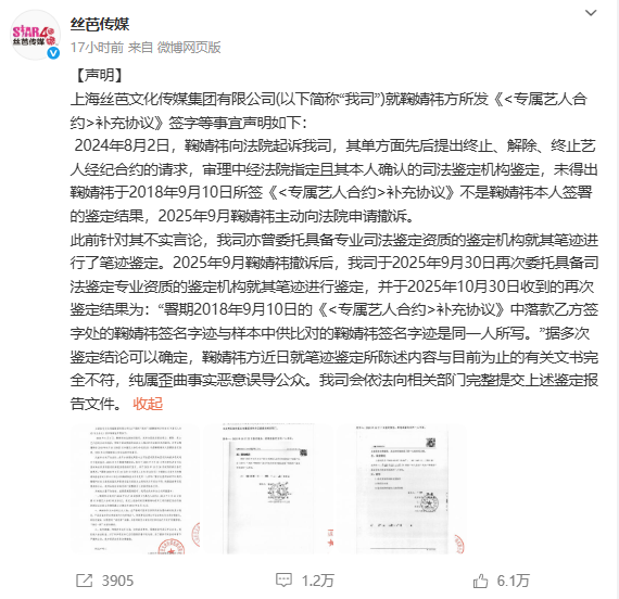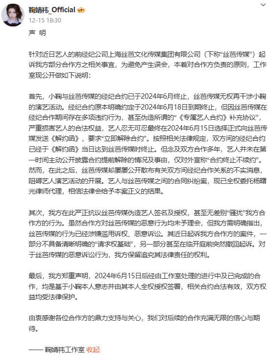 12月16日,鞠婧祎工作室聯合律師連續發布聲明,明確指控前經紀公司絲芭傳媒偽造合約、惡意訴訟,并強調雙方經紀合約已于2024年6月15日依法解除。