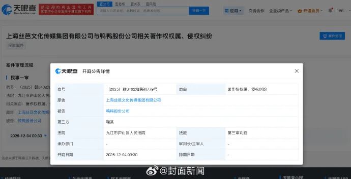 天眼查天眼風險信息顯示,此前,上海絲芭文化傳媒集團有限公司與鴨鴨股份公司相關著作權權屬、侵權糾紛案件開庭公告顯示,該案原告為上海絲芭文化傳媒集團有限公司,第三人為鞠婧祎,該案開庭日期為2025年12月4日,審理法院為九江市廬山區人民法院。