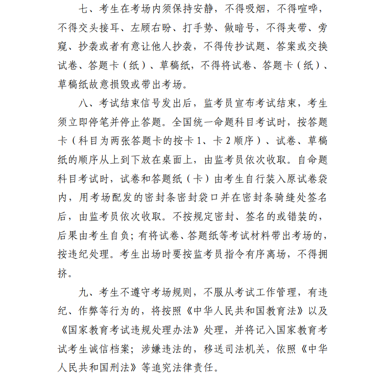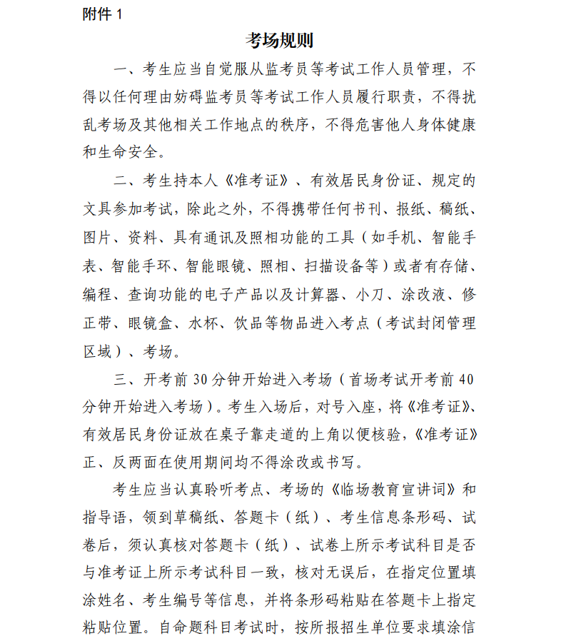 請考生嚴格遵守《考場規則》(附件1),嚴守考試紀律,自覺抵制考試作弊行為。考場均為標準化考場,全程視頻監控,考點實施無線電信號屏蔽,考生違規行為可實時監控或通過視頻回放認定。考試作弊入刑,組織或者參與團伙作弊、代替或者由他人冒名代替參加考試等涉嫌違法的,將移交司法機關處理。