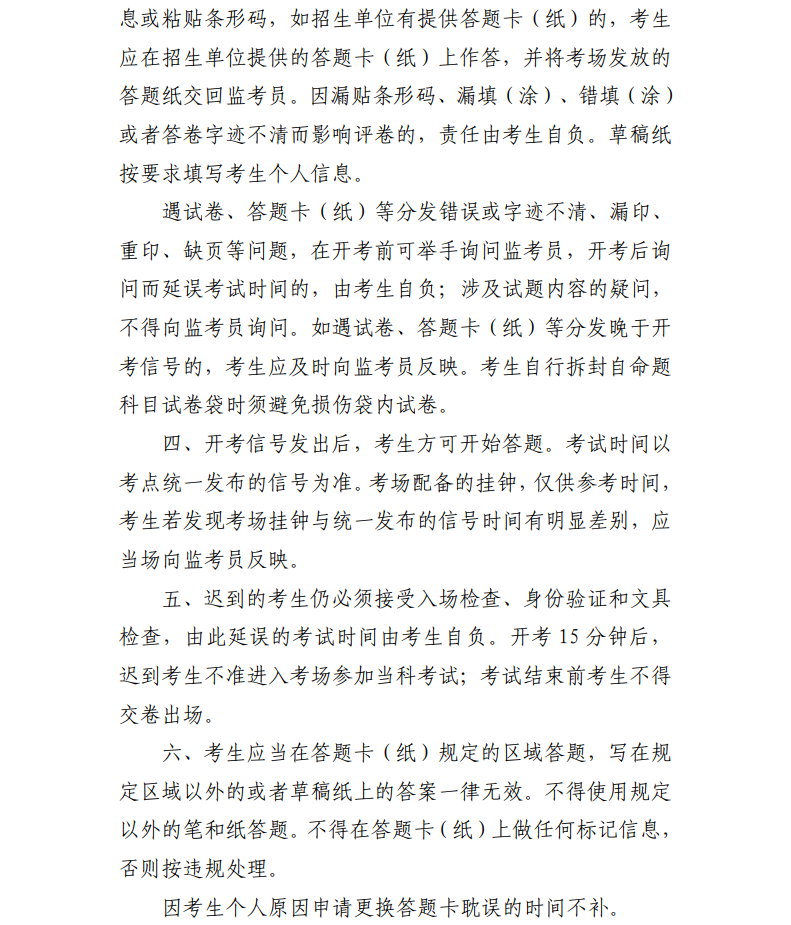自命題科目考試時,考生還可攜帶《準考證》上“招生單位說明”欄目寫明的文具。若考生需攜帶其他文具但《準考證》上“招生單位說明”欄目未寫明的,請及時與所報招生單位聯系。考場統一發放折疊小刀用于拆封自命題科目試卷袋,請勿自帶小刀。