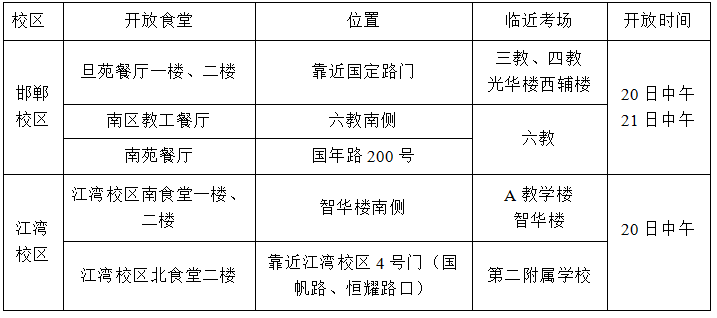 1.考試日中午,考生可到考點周邊商圈用餐,也可在校內部分食堂用餐。校內食堂開放情況如下:
