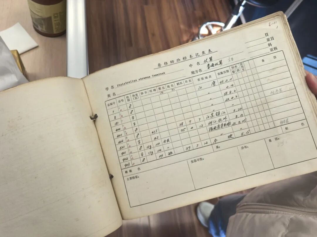 唐仕敏是第五代傳人,也是祖嘉博物館動物標本制作與維護教師,今年已70多歲。在動物標本室,他打開一本邊角磨損、紙頁泛黃的記錄本,上面是父親唐子英工整的手寫筆跡:采集地點、時間、體長、體重……“過去的條件限制,沒有計算機,只能手寫。”他摩挲著紙頁,“但你看,數據非常完整。現在標本干了,量出來的數據不準確,但我們有最原始的記錄。這就是它的價值。”