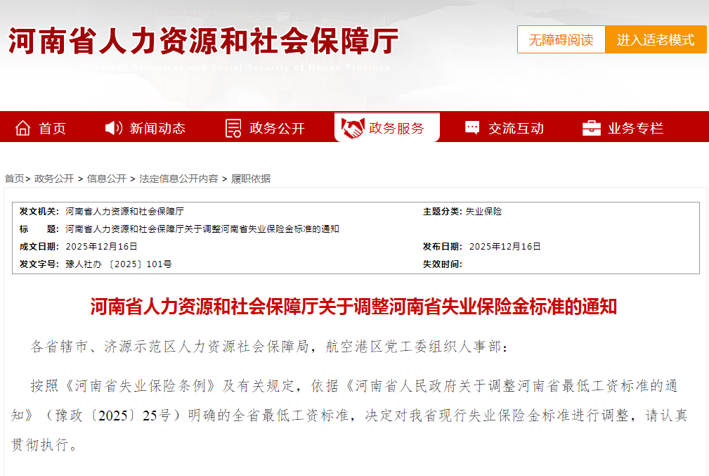 12月16日,河南省人力資源和社會保障廳發(fā)布通知,對河南省現(xiàn)行失業(yè)保險金標準進行調(diào)整。調(diào)整后的失業(yè)保險金標準從2025年12月1日起執(zhí)行。