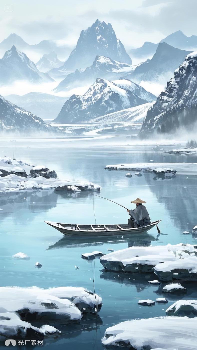 這首詩描繪了一幅冰天雪地的江鄉雪景圖,通過“千山鳥飛絕,萬徑人蹤滅”,營造出極度孤寂的氛圍。而“孤舟蓑笠翁,獨釣寒江雪”,則展現了一位孤獨的漁翁在寒冷江面上獨自垂釣的情景。