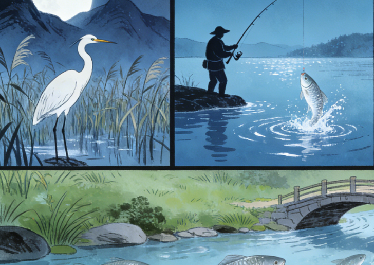 波光蕩漾碎頭霜,釣起銀鱗皆小翔。