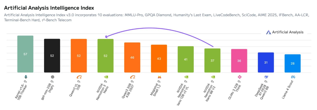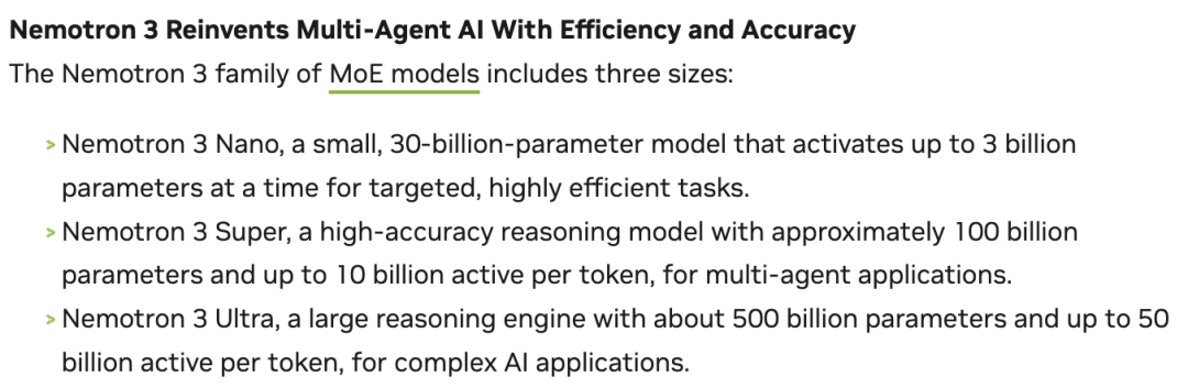 英偉達還推出了最新的Nemotron 3系列開源模型,模型采用MoE架構,支持百萬token上下文窗口。