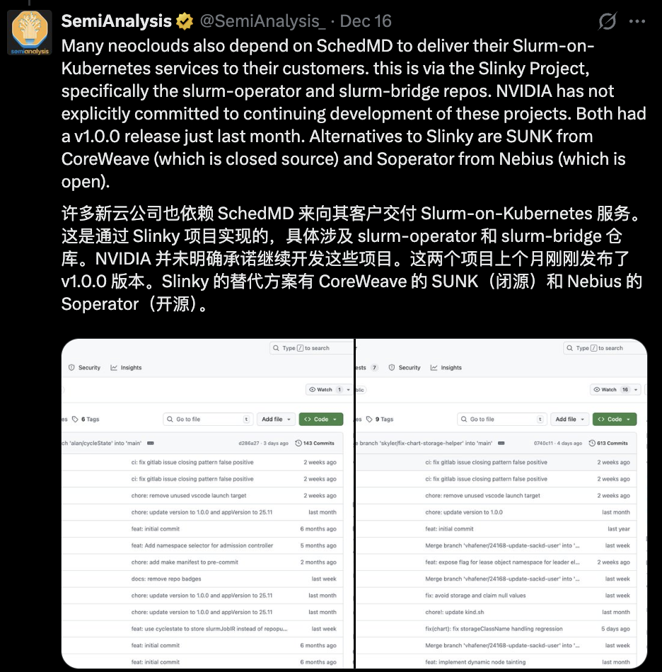但外界的擔憂卻沒有消散,有人注意到,支撐不少新云廠商提供Slurm-on-Kubernetes服務的Slinky項目,涉及到slurm-operator、slurm-bridge等關鍵倉庫,英偉達并未明確表態會持續投入開發。