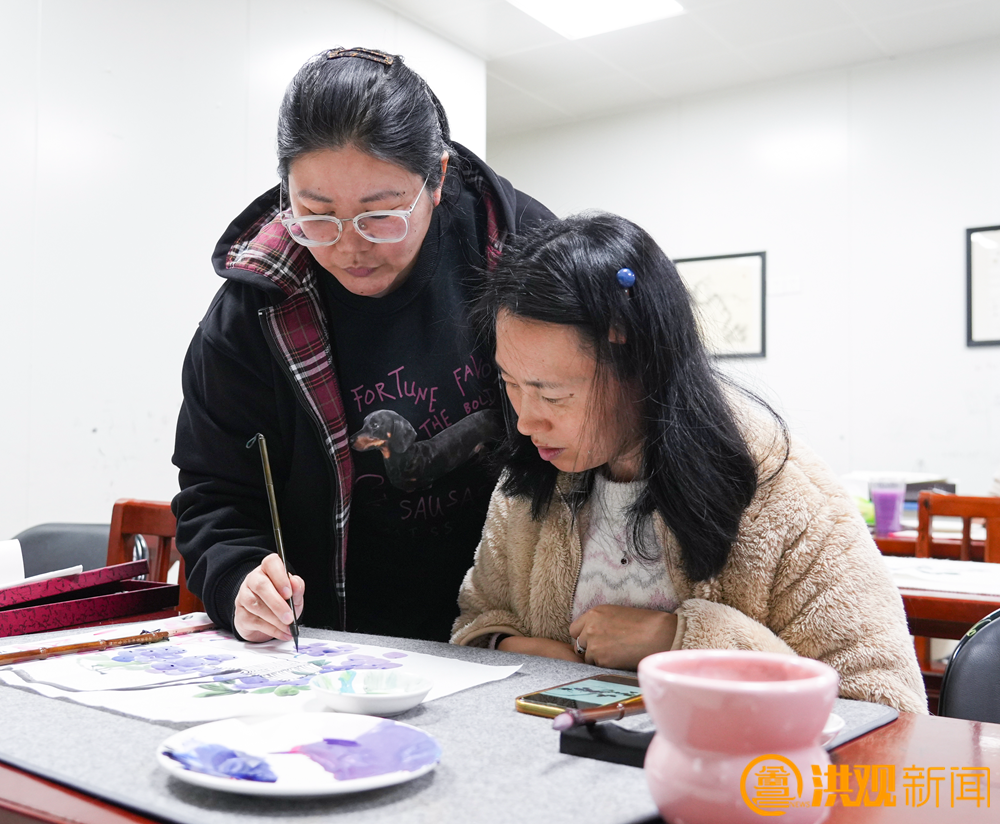 國畫課堂上,幾名學員用毛筆在紙上畫出一幅幅色彩鮮艷的作品。繪畫中,學員們時不時聚在一起交流心得,教師則走到每一位學員身邊,指出大家需要改進的地方。