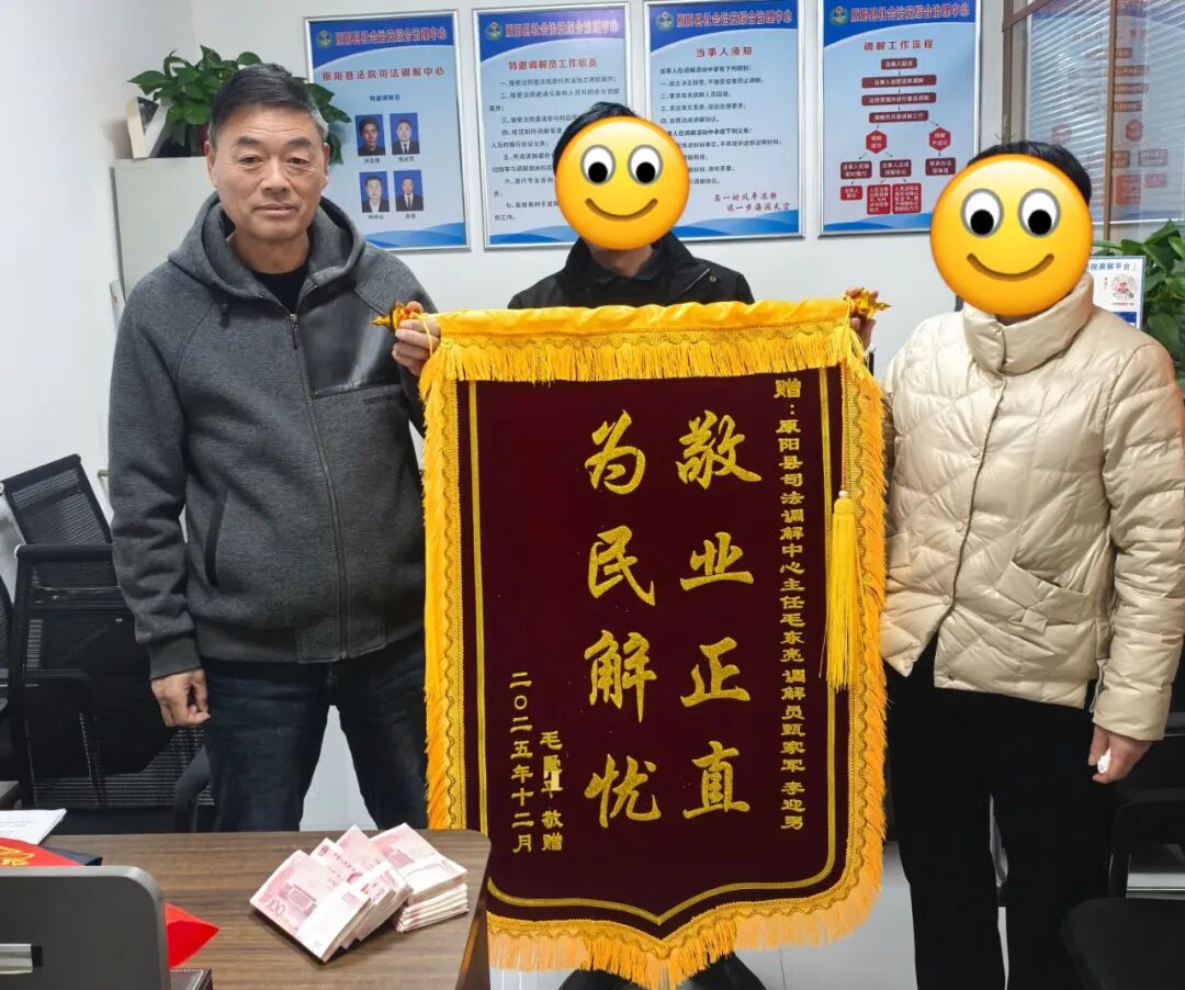 糾紛解決后,毛某特意制作錦旗,專程送到原陽縣法院司法調解中心,親手贈予甄家軍、李迎男,以此表達對二人耐心調解、高效解憂的感激之情。