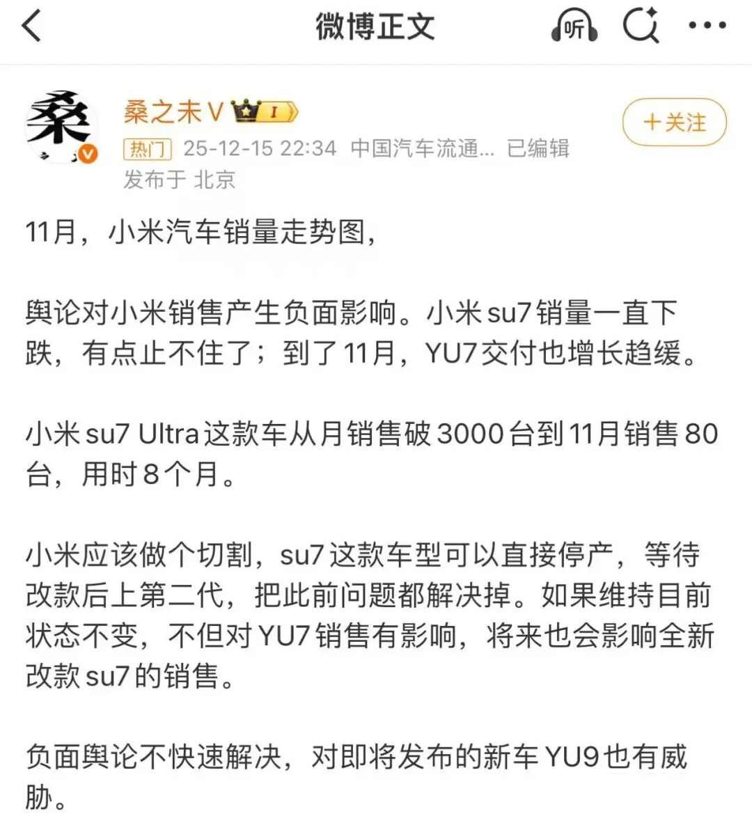 025年3月,小米推出了SU7 Ultra這款車,雷軍把它叫做“年輕人第一臺(tái)性能車”,第一個(gè)月就賣出三千輛,當(dāng)時(shí)媒體評(píng)價(jià)很高,認(rèn)為它是國(guó)產(chǎn)電動(dòng)汽車的新標(biāo)桿,但到了11月,銷量掉到每月只有八十輛,超過九成的人不再購(gòu)買,官方?jīng)]有直接提這件事,反而把普通版、Ultra版和YU7這些車型的銷量合并起來,說總交付量已經(jīng)突破四萬輛。