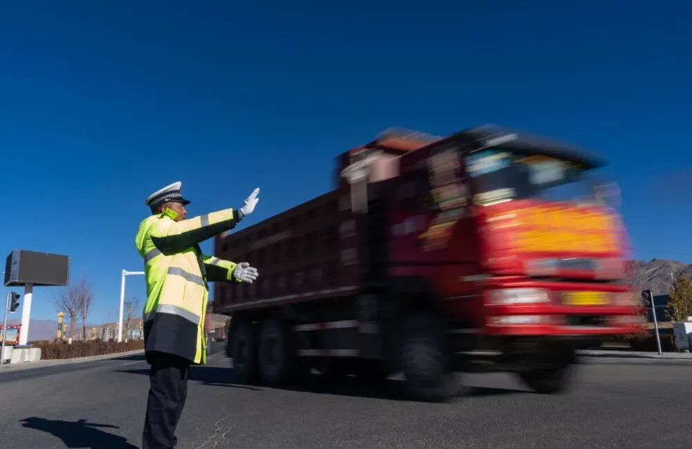 在西藏日喀則市區,交警指揮交通讓完成救災物資運輸任務的救援車輛順利出城。新華社發