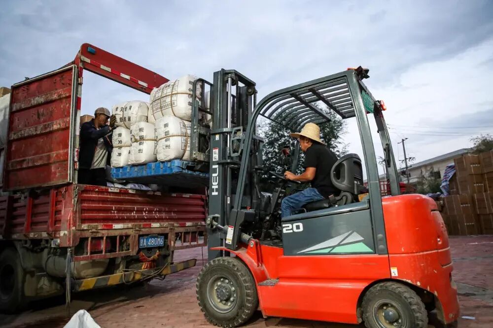 在甘肅榆中縣救災物資儲備服務中心,工作人員將救災物資裝車。新華社發
