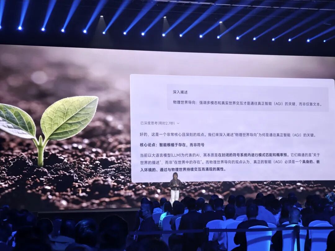 她認(rèn)為,大模型本質(zhì)上是用了算力的暴力美學(xué),直接去攻克了最頂層的語(yǔ)言,但是它跳過(guò)了中間的非常多的步驟,比如對(duì)世界的感知、模擬,以及作為實(shí)體與環(huán)境產(chǎn)生交互。