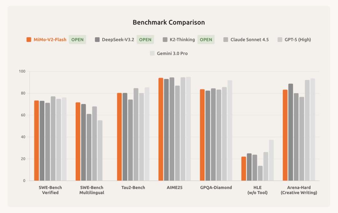 在輕量化的模型架構(gòu)之上,MiMo-V2-Flash仍然實(shí)現(xiàn)了更高水平的智能表現(xiàn),在多項(xiàng)基準(zhǔn)測(cè)試中獲得了不錯(cuò)的成績(jī)。