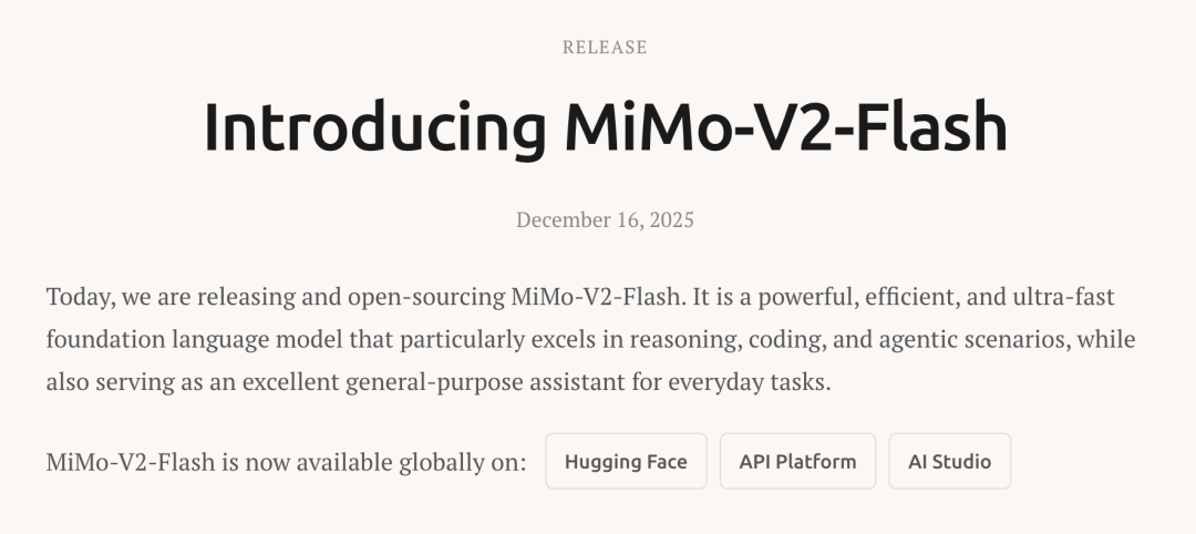 正是在這樣的背景下,小米MiMo團(tuán)隊(duì)在12月16日晚上發(fā)布并開源了MiMo-V2-Flash。團(tuán)隊(duì)在官方博客中介紹,這是一款強(qiáng)大、高效且超快速的基座語(yǔ)言模型,在推理、編程和智能體場(chǎng)景中表現(xiàn)尤為出色,同時(shí)也是處理日常任務(wù)的優(yōu)秀通用助手。
