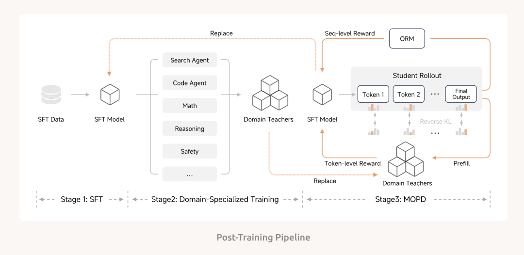 根據(jù)官方博客,MOPD采用了解耦設(shè)計(jì),支持靈活地集成新的教師模型和ORM,并自然而然地實(shí)現(xiàn)“教與學(xué)”的閉環(huán)迭代:通過(guò)蒸餾得到的學(xué)生模型可以演化為更強(qiáng)的教師模型,從而實(shí)現(xiàn)能力的持續(xù)自我提升。