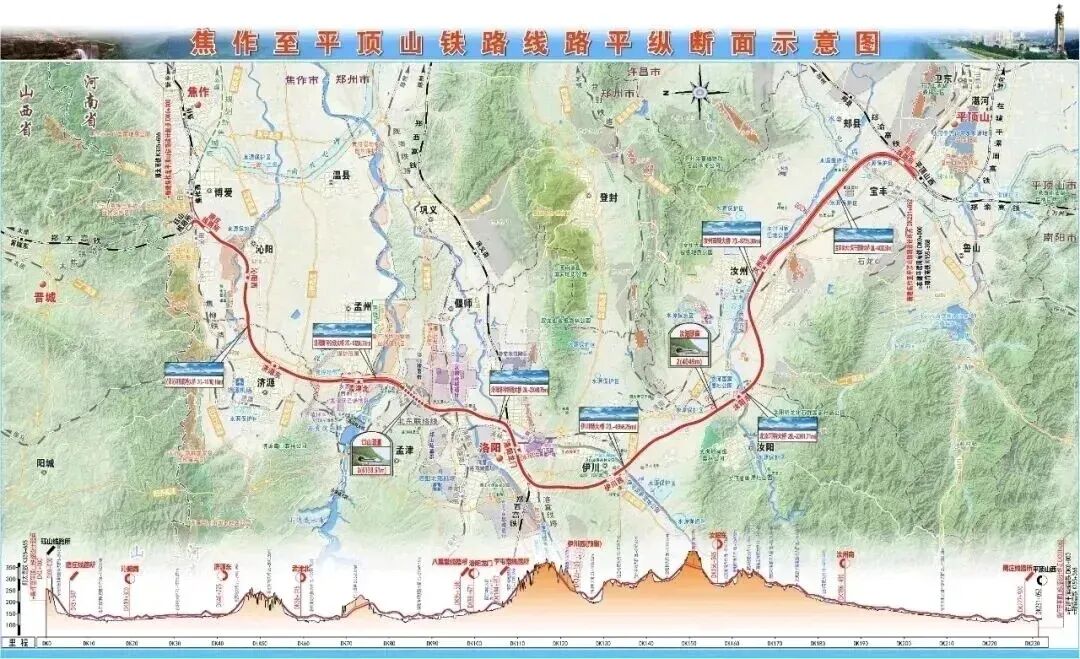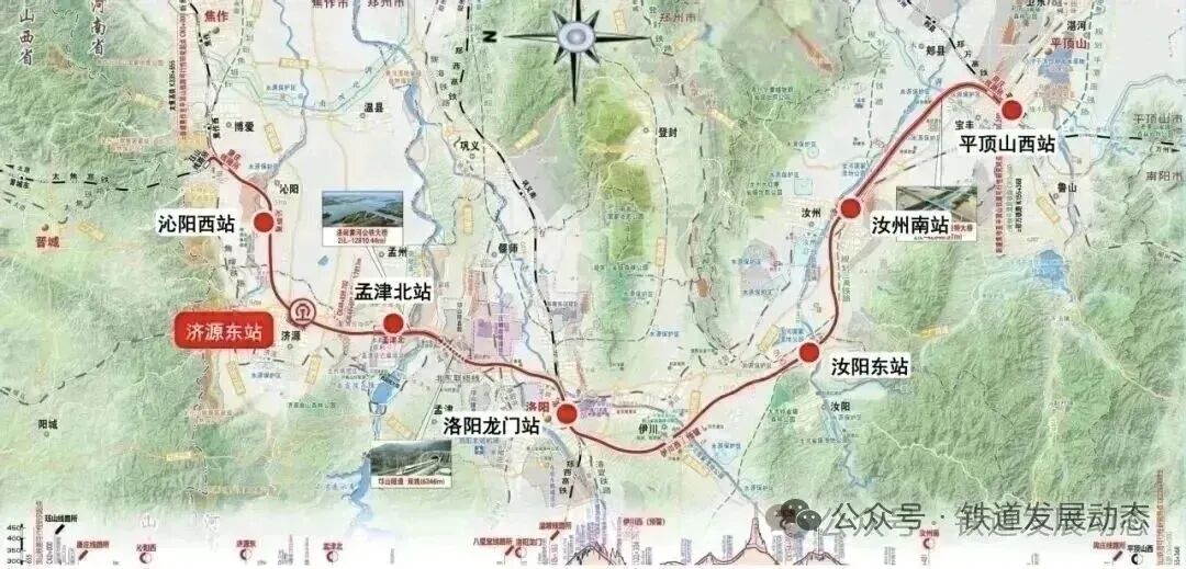 線路起自鄭太客專玨山線路所,向南經焦作市沁陽市、濟源示范區,跨黃河后引入鄭西高鐵洛陽龍門站,出站后經洛陽市伊川縣、汝陽縣,平頂山市汝州市,接入鄭渝高鐵平頂山西站。項目總投資超400億元,新建正線全長230.488公里,項目建設工期4年。