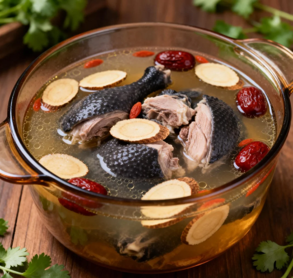 做法:取丹參10克(紗布包好)、紅棗5枚、枸杞10克,與焯水的烏雞塊一同燉煮1.5小時。