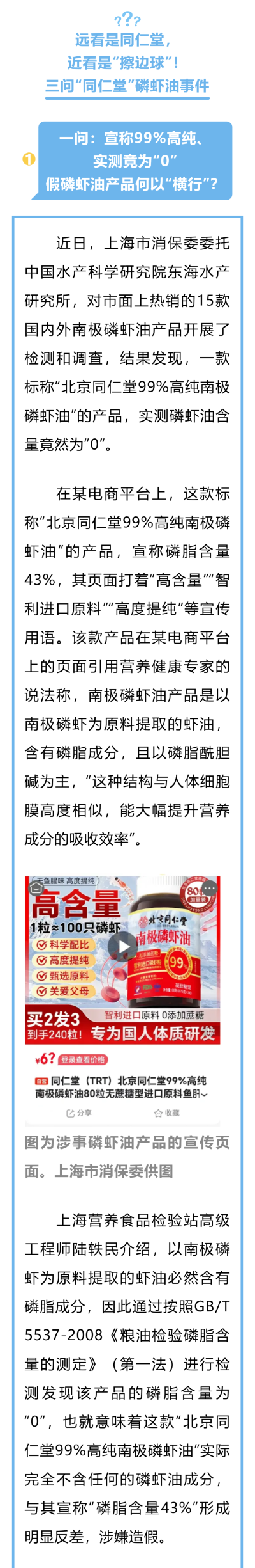 上海營養食品檢驗站高級工程師陸軼民介紹,以南極磷蝦為原料提取的蝦油必然含有磷脂成分,因此通過按照GB/T 5537-2008《糧油檢驗磷脂含量的測定》(第一法)進行檢測發現該產品的磷脂含量為“0”,也就意味著這款“北京同仁堂99%高純南極磷蝦油”實際完全不含任何的磷蝦油成分,與其宣稱“磷脂含量43%”形成明顯反差,涉嫌造假。