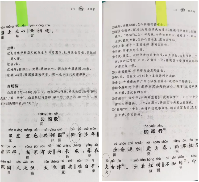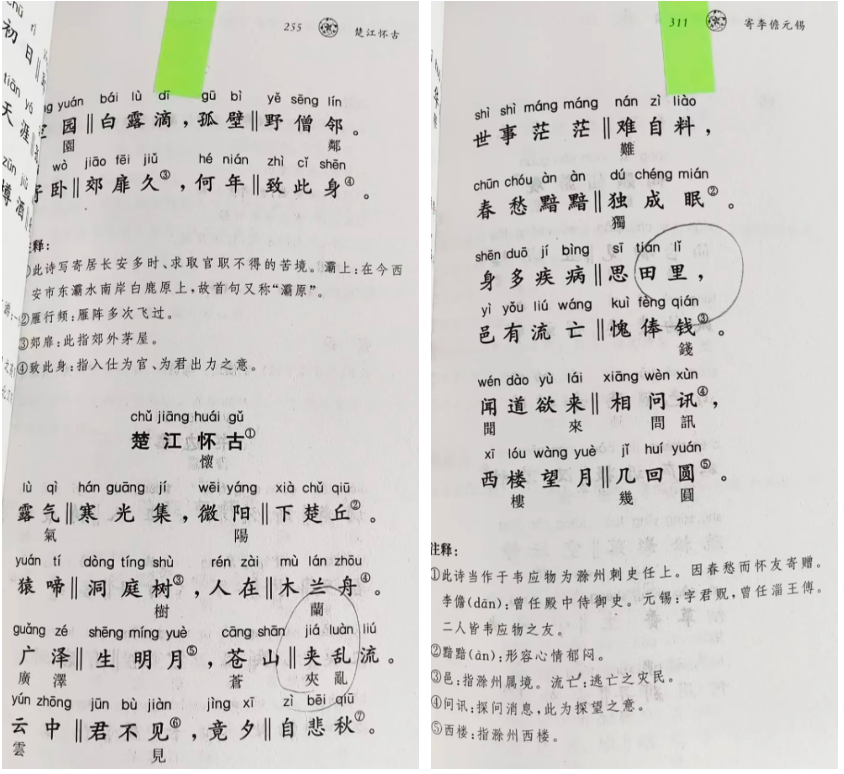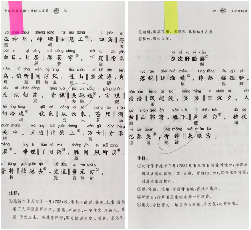 該版《唐詩三百首》是“中華經典誦讀”叢書之一種,2012年第1次印刷。當時聽取一線老師根據教學要求所提出的建議,我們在原詩的正文下面標出了對應的繁體字。因為需要重新倒版和簡繁轉換,致使出現了一些訛誤,后來每次重印時雖也做過零星修訂,但都不徹底。盛大林先生指出的“夾”誤作“濤”,系改稿時全書替換操作失誤所致;“里”誤作“裏”、“大歷”誤作“大歷”等,系簡繁直接轉換造成。