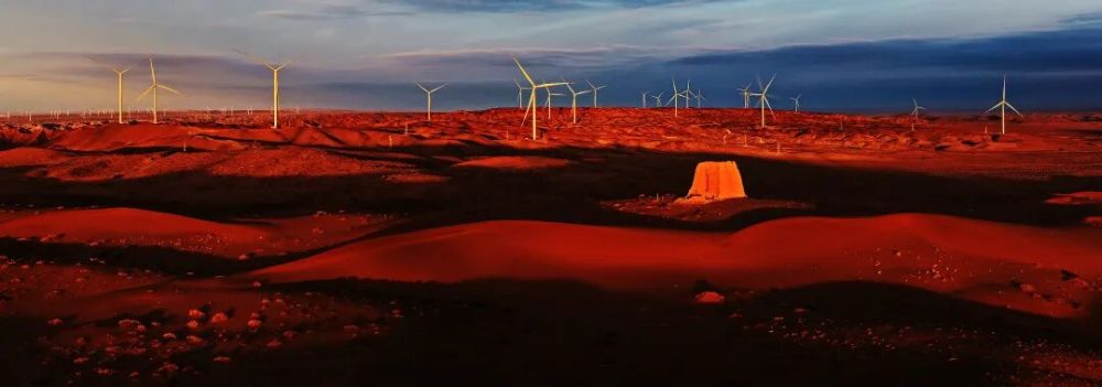 2025年11月16日拍攝于甘肅省張掖市高臺(tái)縣北部灘風(fēng)電項(xiàng)目基地。紅沙漫卷的戈壁上,殘舊烽燧靜立夕陽里,身后成排風(fēng)電裝置舒展扇葉。@阿正