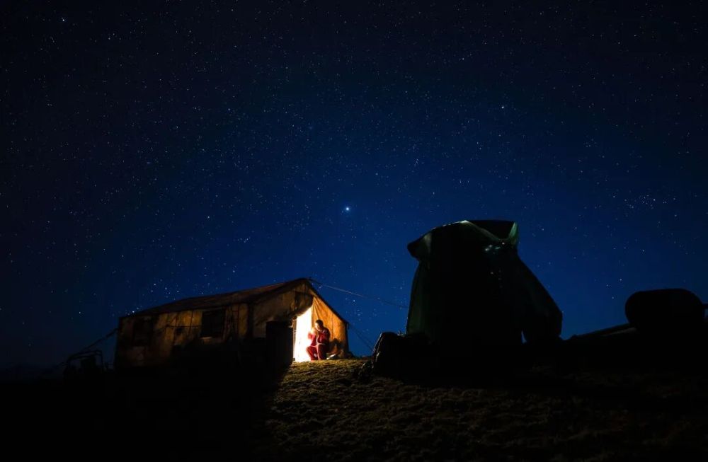 這是今年五一前夕,我和新疆日?qǐng)?bào)記者蔡老師到物探隊(duì)采訪拍下的一張照片。在海拔3000多米的昆侖山巔,夜幕降臨,辛苦了一天的鉆井機(jī)組鉆工們回到山頂臨時(shí)宿營地,孤零零的小帳篷透出溫暖的燈光,一名鉆工坐在帳篷口吃晚飯,頭頂是西昆侖的漫天星河,他們是找油找氣的石油人,他們的工作既浪漫又艱辛。@王健