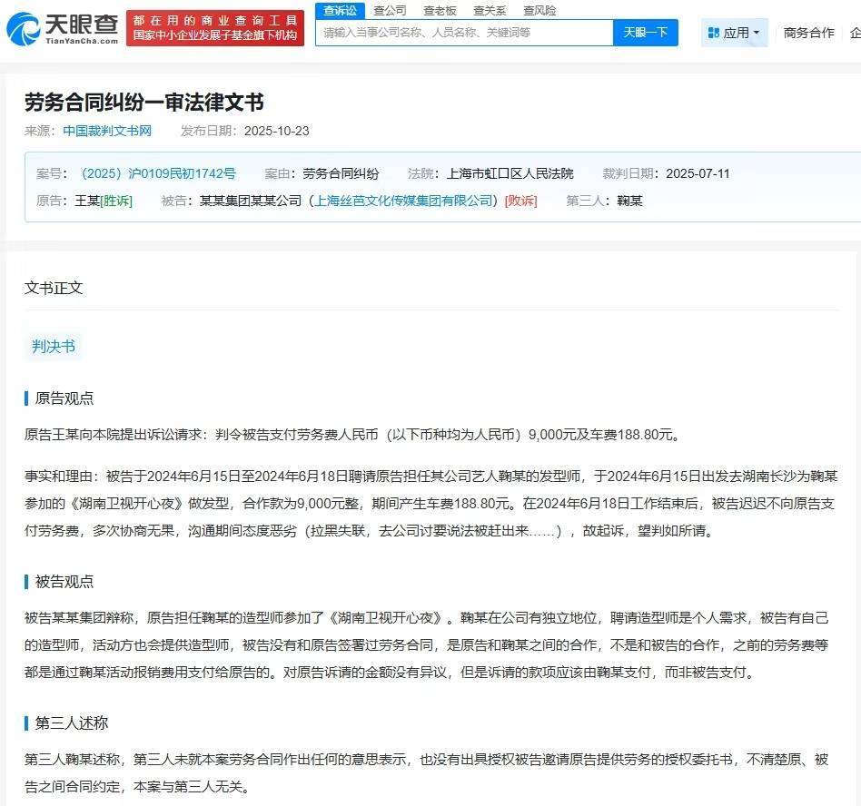 天眼查天眼風(fēng)險(xiǎn)信息顯示,近期,法院公開王某與上海絲芭文化傳媒集團(tuán)有限公司勞務(wù)合同糾紛裁判文書。原告王某訴稱于2024年6月15日至6月18日受被告聘請(qǐng)擔(dān)任其公司藝人鞠婧祎的發(fā)型師,為其參加的活動(dòng)做發(fā)型。工作結(jié)束后,被告遲遲不向原告支付勞務(wù)費(fèi),多次協(xié)商無果,溝通期間態(tài)度惡劣(拉黑失聯(lián),去公司討要說法被趕出來),故起訴。