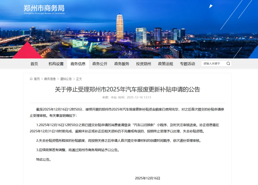 關于停止受理鄭州市2025年汽車報廢更新補貼申請的公告 截至2025年12月16日12時50分,接續開展的鄭州市2025年汽車報廢更新補貼資金額度已使用完畢,對之后首次提交的補貼申請停止受理審核。有關事宜明確如下: 1.2025年12月16日12時50分之前已提交補貼申請的消費者請登錄“汽車以舊換新”小程序,及時關注審核進度。補正信息需在2025年12月31日18時前完成,逾期未補正或補正后相關資料仍不完善或有誤的,按照終止受理予以處理,失去補貼資格。 2.失去補貼資格所釋放的補貼額度,將按照關停之后申請人首次提交申請材料的創建時間順序,依次遞補受理審核。 3.后續政策若有調整,將通過鄭州市商務局網站予以公告。 特此公告。 ? ? ? ? ? ? ? ? ? ? ? ? ? ? ? ? ? ? ? ? ? ? ? ? ? ? ? ? ? ? ? ? ? ? ? ? ? ? ? ? ? ? ? ? ? ? ? ? ? ? ? 2025年12月16日?