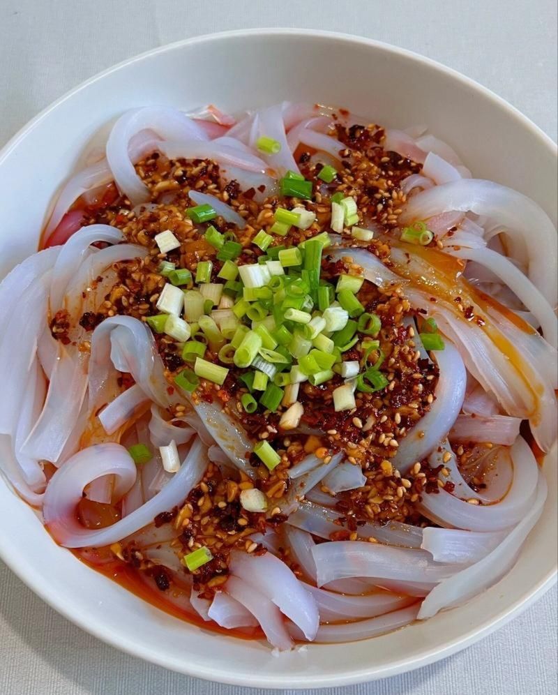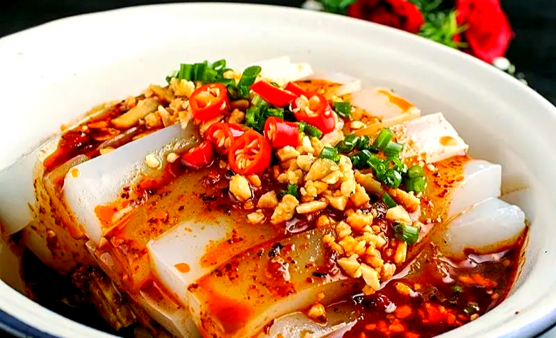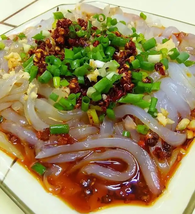涼粉這種小吃在確山流傳已有上千年歷史,清康熙年間的鄉土志記載其“色若琥珀”,清末還發展出涼皮、梗皮等衍生品種。?傳統制作技藝強調使用特定豌豆品種和麥秸火候控制,現代仍延續古法工藝,成為豫南地區代表性地方美食。?食用時,確山涼粉常搭配黃瓜絲、面筋塊、綠豆芽等配料,澆上辣椒油、蒜汁、醋等調料,攪拌均勻后香辣與清爽交織,既能解渴也可充饑。?其歷史淵源可追溯至北宋,歷經千年依然深受食客喜愛。?