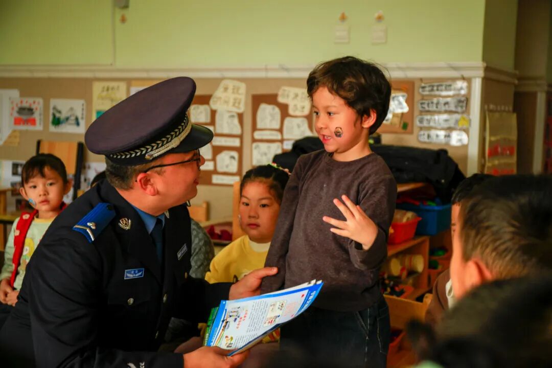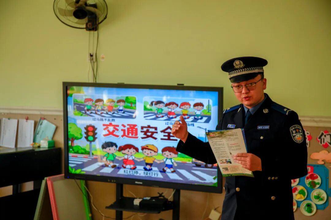 活動中,民輔警結合幼兒年齡小、認知能力有限的特點,摒棄生硬說教,精心準備了卡通交通安全圖片、趣味動畫短片等素材。“小朋友們,紅燈亮了要怎么做呀?”民輔警用通俗易懂的語言、親切活潑的語氣,向孩子們講解過馬路、坐校車、識別交通信號燈等日常交通安全知識,將抽象的交通規則轉化為孩子們容易理解的生活常識。