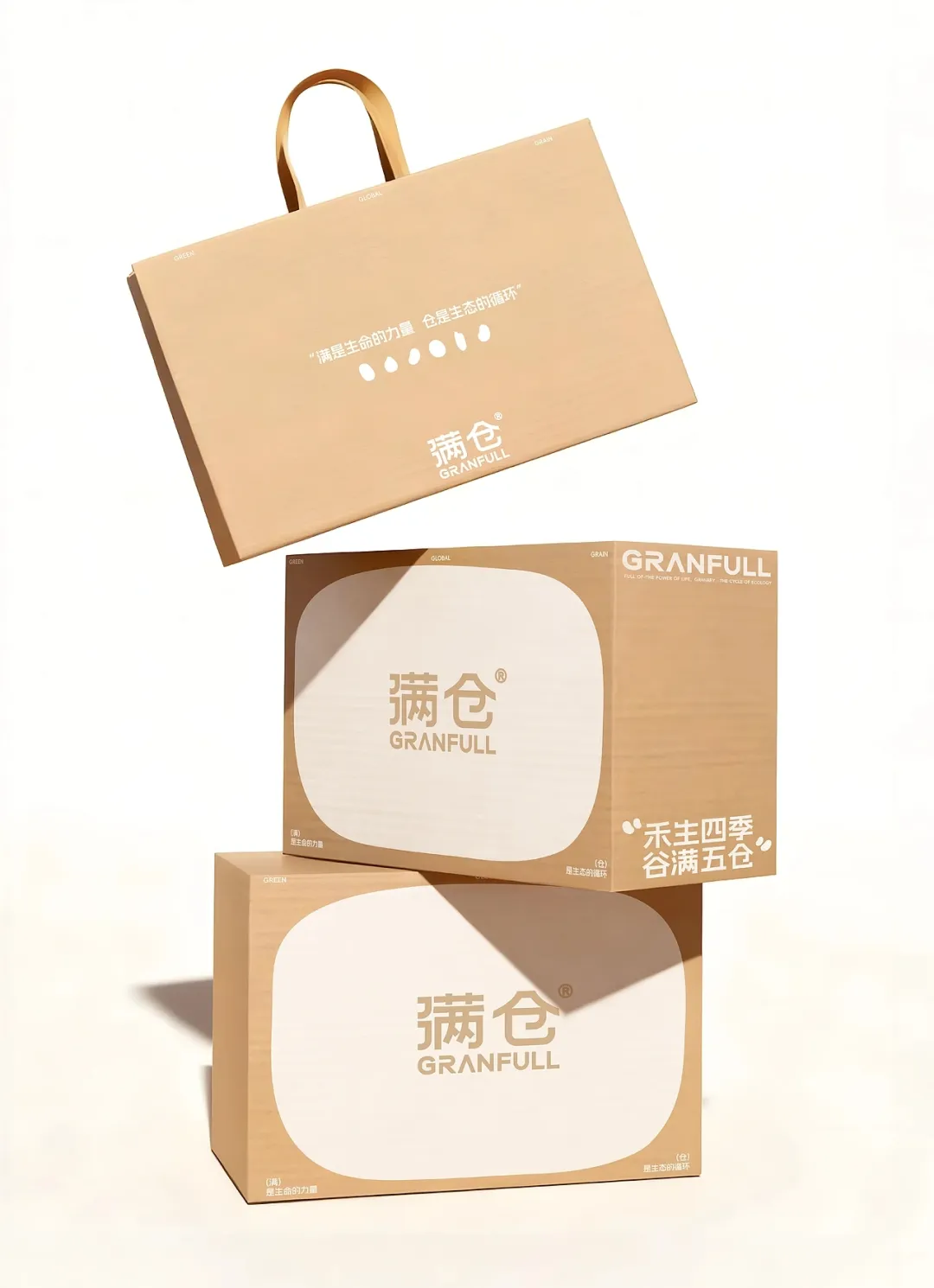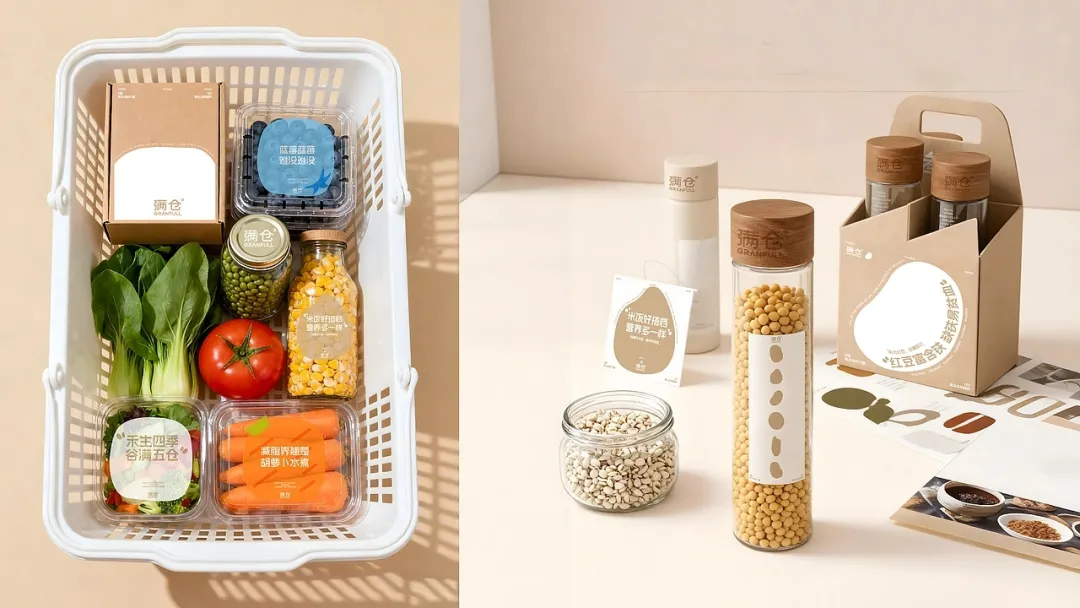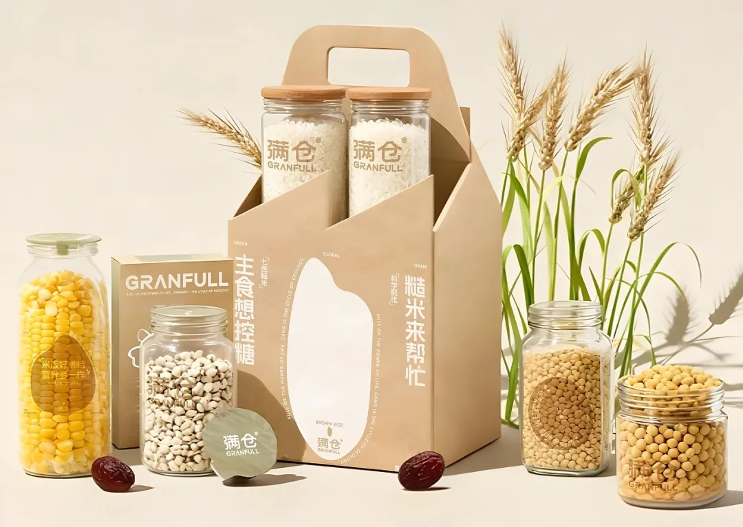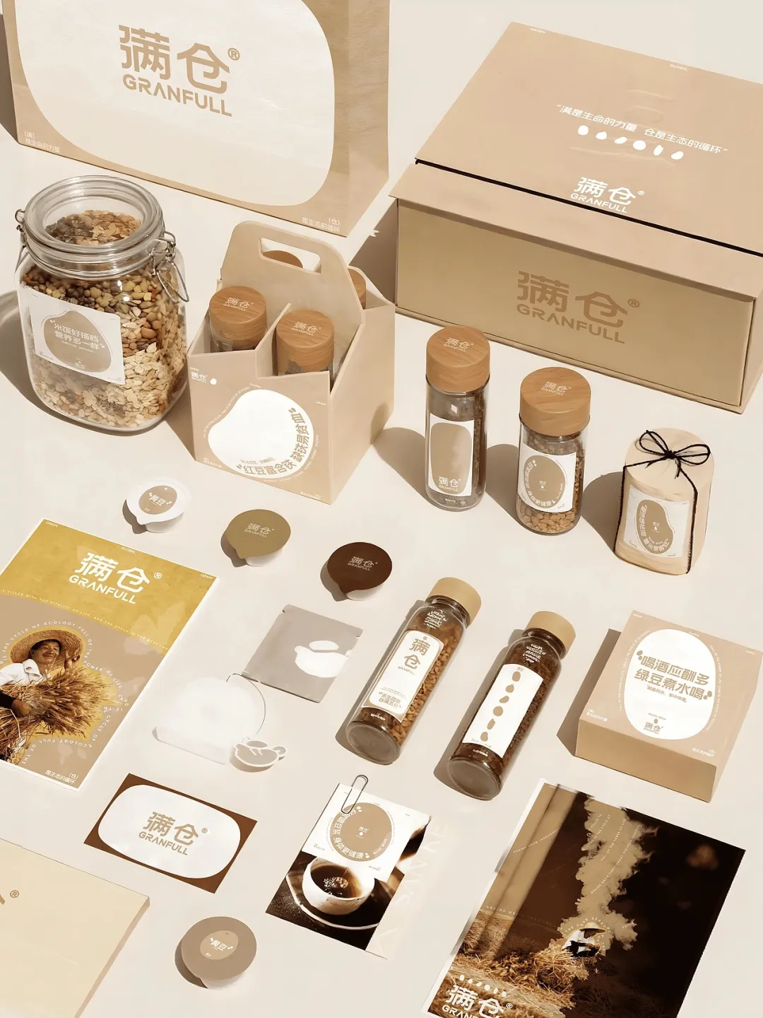 包裝方面,整體像把豐收的煙火氣融進(jìn)了現(xiàn)代設(shè)計(jì)里。暖棕底色是土地的原色,玻璃罐、便攜盒的組合既保留了五谷雜糧的質(zhì)樸,又用統(tǒng)一的品牌標(biāo)識(shí)勾連起健康消費(fèi)需求;而搭配蔬果的收納籃、可復(fù)用的玻璃罐,則把實(shí)用與環(huán)保焊在了品牌基因里,讓 “滿倉(cāng)” 不只是農(nóng)產(chǎn)品,更像幫都市人打理廚房的生活伙伴。