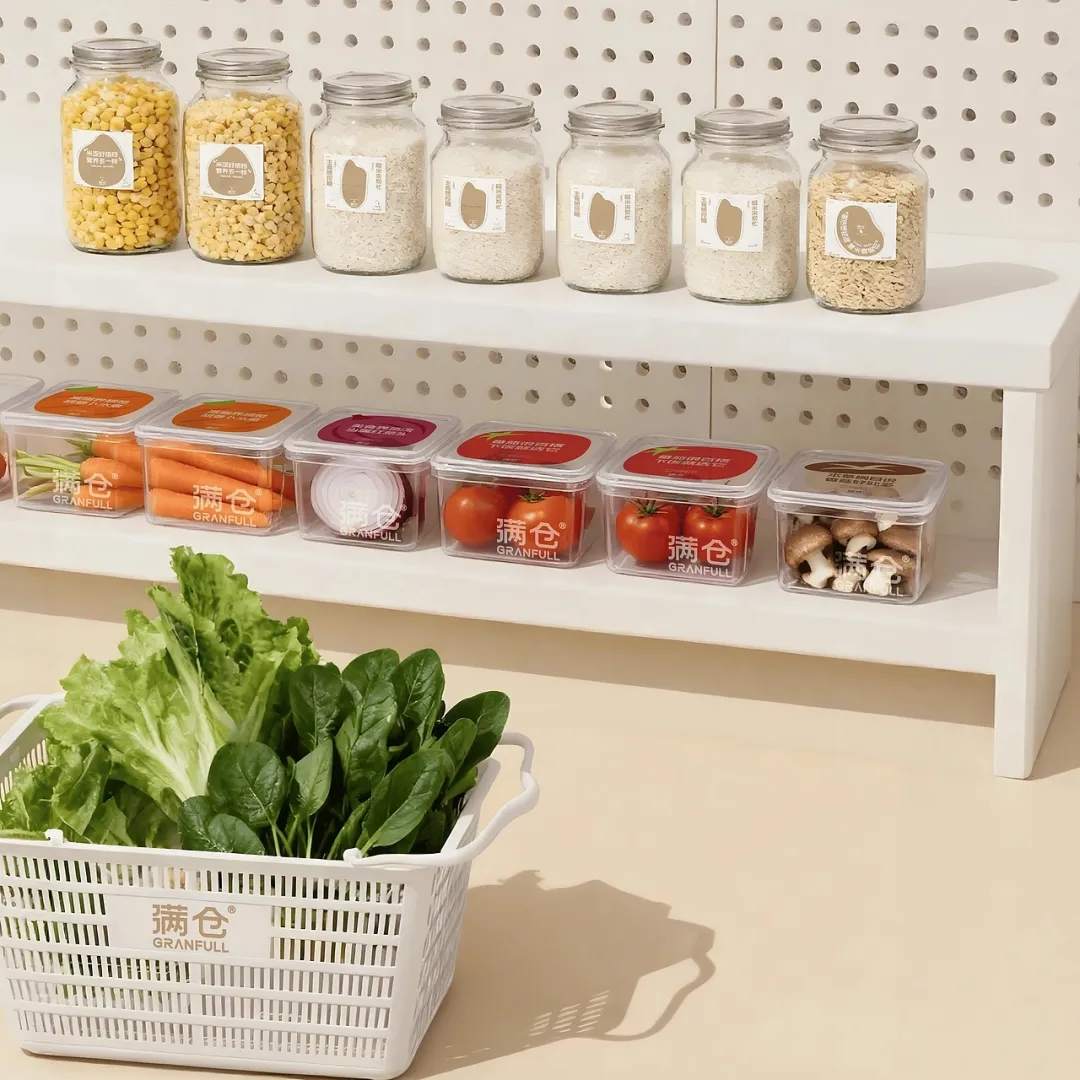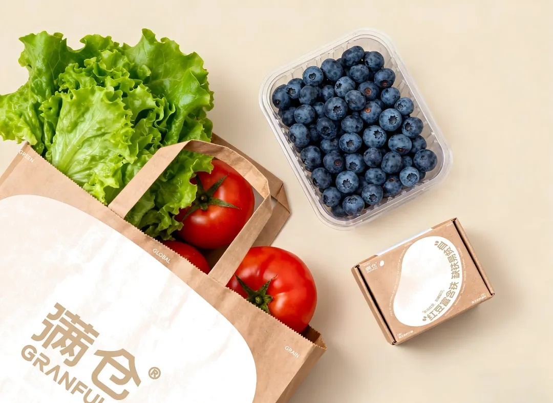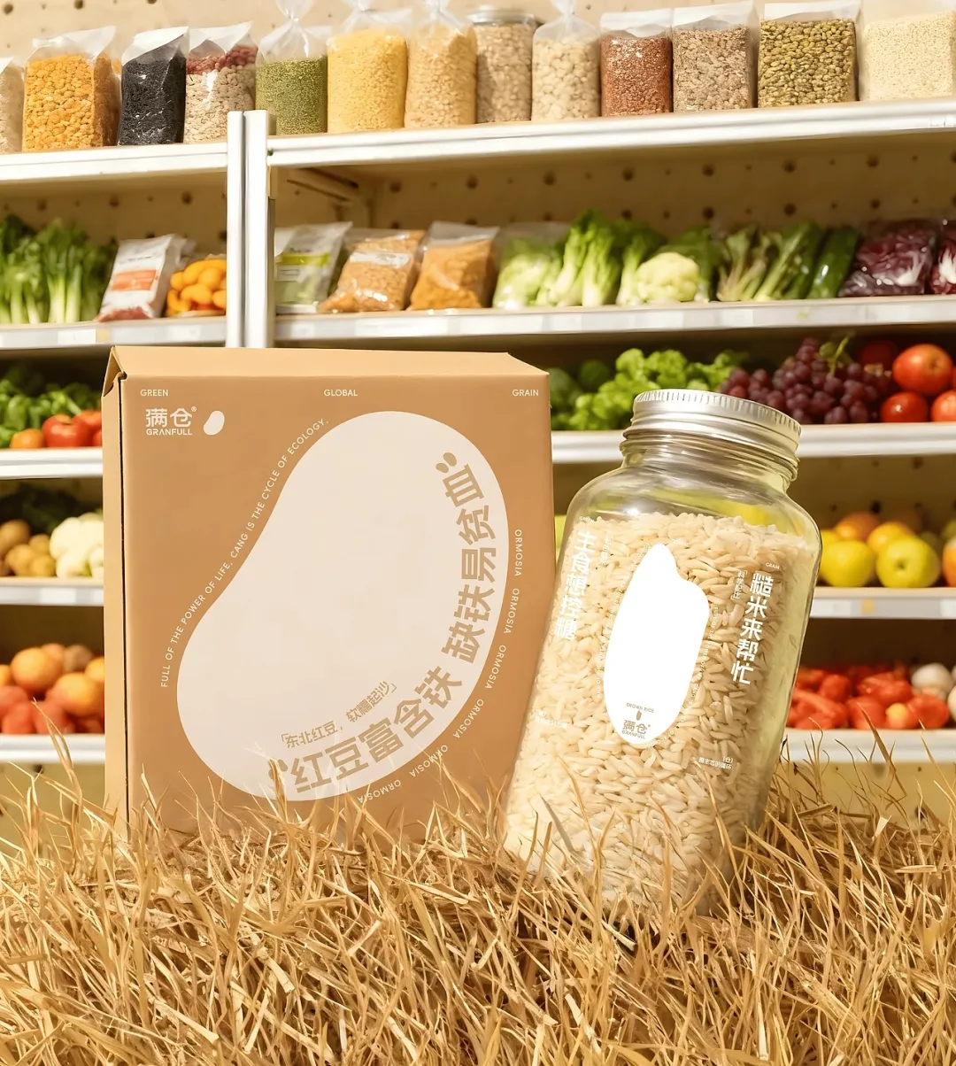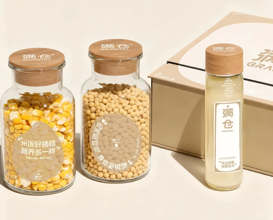 包裝方面,整體像把豐收的煙火氣融進(jìn)了現(xiàn)代設(shè)計(jì)里。暖棕底色是土地的原色,玻璃罐、便攜盒的組合既保留了五谷雜糧的質(zhì)樸,又用統(tǒng)一的品牌標(biāo)識(shí)勾連起健康消費(fèi)需求;而搭配蔬果的收納籃、可復(fù)用的玻璃罐,則把實(shí)用與環(huán)保焊在了品牌基因里,讓 “滿倉(cāng)” 不只是農(nóng)產(chǎn)品,更像幫都市人打理廚房的生活伙伴。