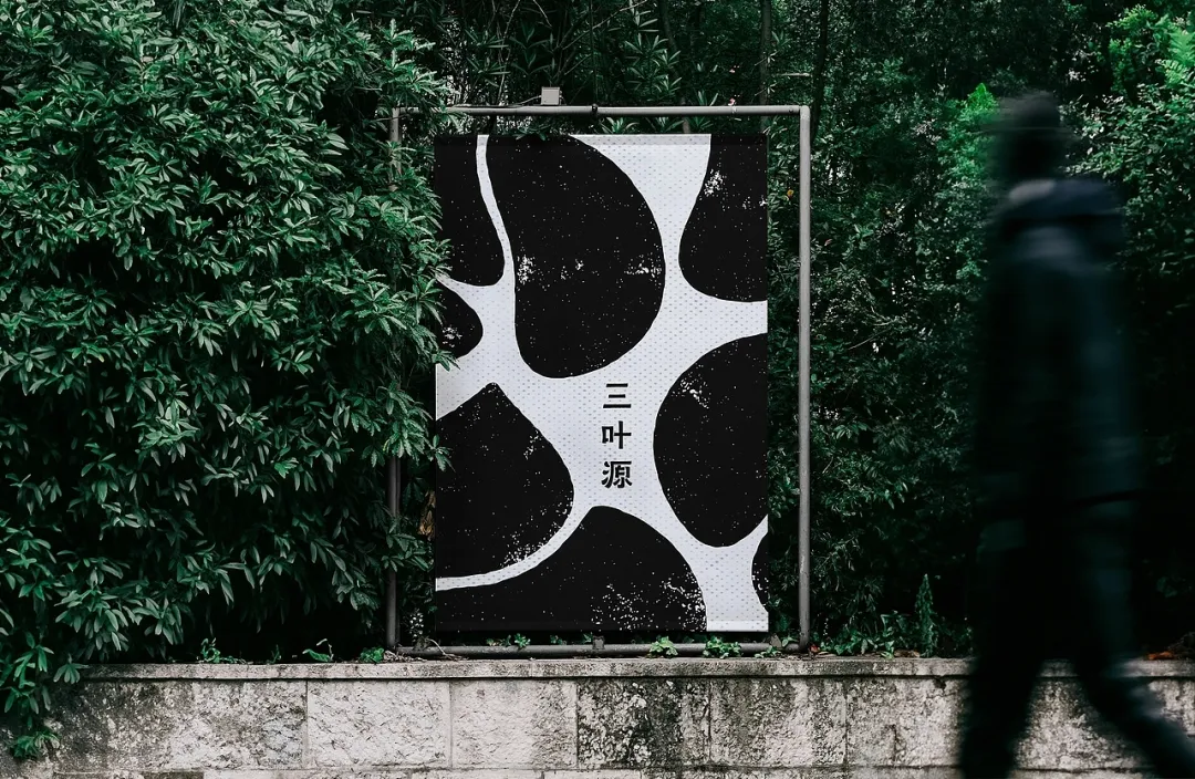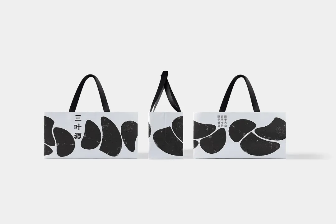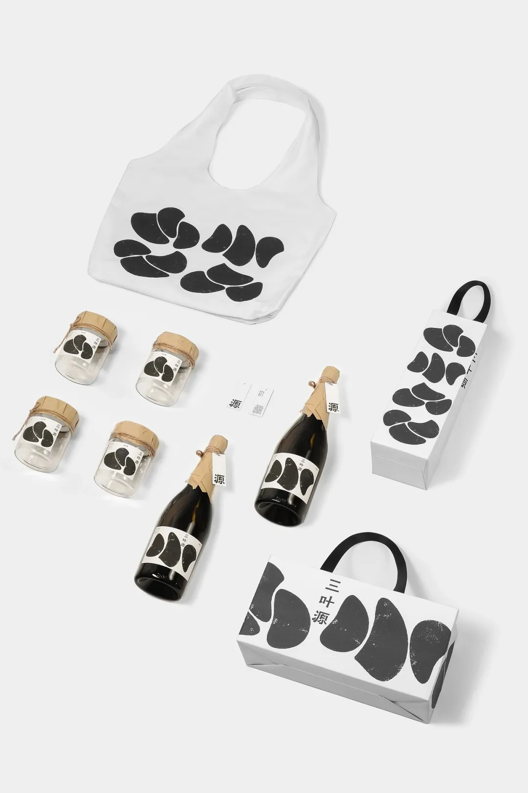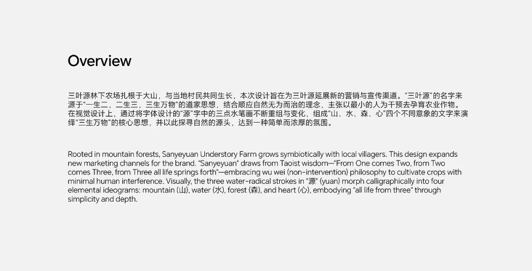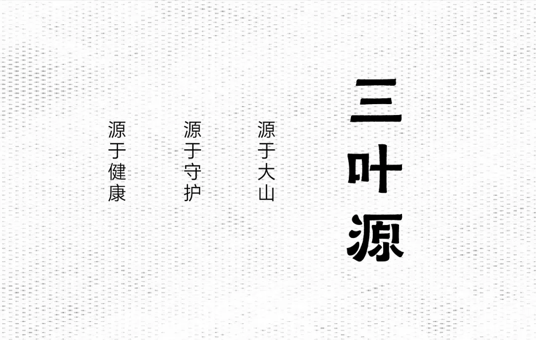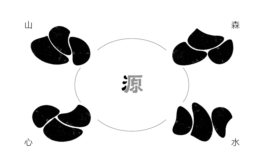 “三葉源"的名字來源于"一生二,二生三,三生萬物"的道家思想,結(jié)合順應(yīng)自然無為而治的理念,主張以最小的人為干預(yù)去孕育農(nóng)業(yè)作物。在視覺設(shè)計(jì)上,通過將字體設(shè)計(jì)的“源”字中的三點(diǎn)水筆畫不斷重組與變化,組成“山、水、森、心"四個(gè)不同意象的文字來演繹“三生萬物"的核心思想,并以此探尋自然的源頭,達(dá)到一種簡(jiǎn)單而濃厚的氛圍。