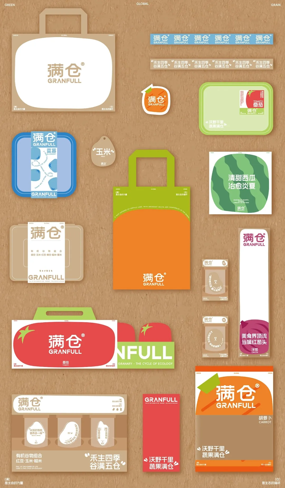 設(shè)計(jì)以“滿倉(cāng)哲學(xué)”為核心,“滿倉(cāng)”喚醒人們對(duì)豐收、富足、安心的集體記憶--“滿”是生命的力量,象征著我們希望每一位消費(fèi)者在食用品牌的農(nóng)產(chǎn)品美食時(shí),能感受到滿滿的幸福感、歸屬感和滿足感,同時(shí)體會(huì)到產(chǎn)品帶來的開心與喜悅。“倉(cāng)”則是生態(tài)的循環(huán),代表品牌廣泛涵蓋的農(nóng)產(chǎn)品種類和創(chuàng)新食品。