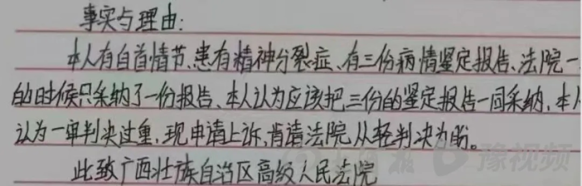 ( 何某某手寫的上訴要求輕判的申請(受訪者供圖) )