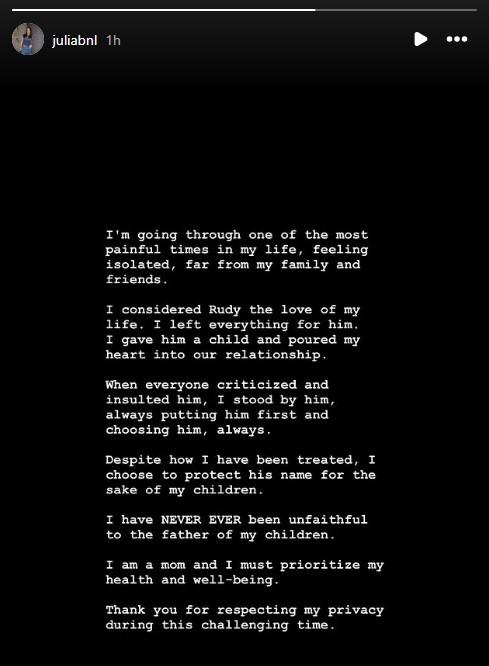 在被戈貝爾分手之后,博尼利亞在社交媒體發(fā)布聲明:“我正在經(jīng)歷人生中最痛苦的一段時光,感到孤獨無助,遠(yuǎn)離家人和朋友。我曾將魯?shù)弦暈橐簧膿磹邸N覟樗艞壛艘磺校挛覀兊暮⒆樱⑷娜馔度氲竭@段感情中。當(dāng)所有人都在批評和羞辱他時,我始終站在他身邊,永遠(yuǎn)將他放在第一位,選擇他、支持他。盡管我遭受了這樣的對待,但為了孩子們,我仍選擇維護(hù)他的名聲。我從未、從未對孩子的父親有過不忠。身為母親,我必須優(yōu)先考慮自己的健康和幸福。感謝你們在這個艱難時期尊重我的隱私。”