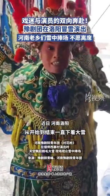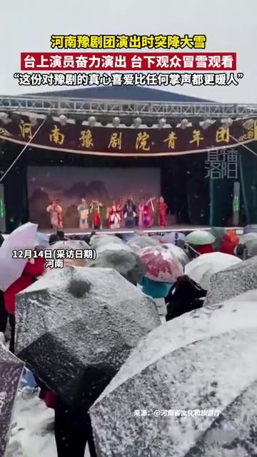 河南豫劇團演出時突降大雪,臺上演員奮力演出,臺下觀眾冒雪觀看。“這份對豫劇的真心喜愛比任何掌聲都更暖人”
