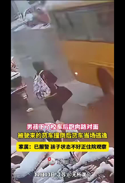 男孩下了校車后跑向路對面被貨車撞倒還當(dāng)場逃逸