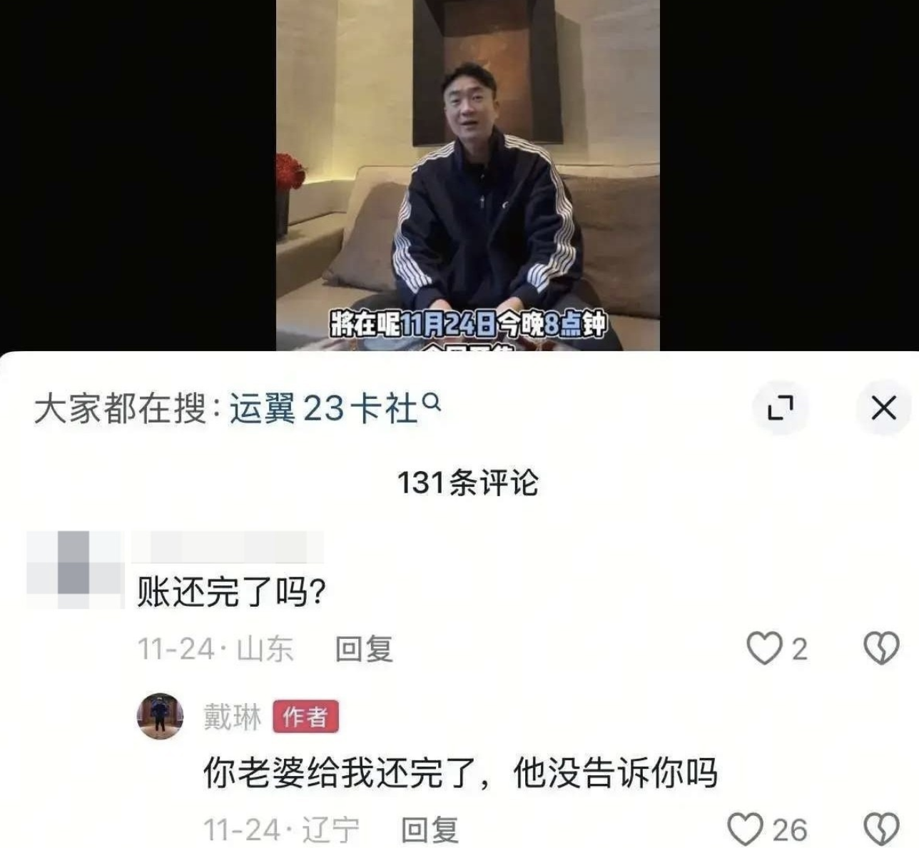 11月份,有球迷在社媒向戴琳提出問題:“賬還完了嗎?”戴琳對此做出回復(fù):“你老婆給我還完了,他沒告訴你嗎?”